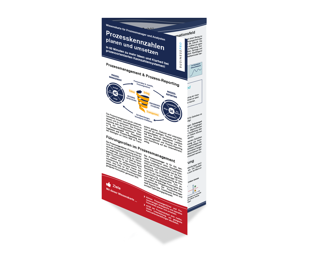 Die Wissenskarte „Prozesskennzahlen planen und umsetzen“ wendet sich an Prozessmanager und Analysten. Auf sechs Seiten erhält der Leser in kompakter Form konzeptionelles und methodisches Wissen an die Hand, um aussagefähige Kennzahlen zu Geschäftsprozessen zu identifizieren, zusammen zu stellen und darzustellen.